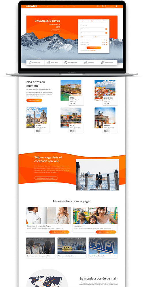 For this redesign of the already existing EasyJet website, the challenge was to modernize and reorganize the user experience and interface, while staying as close as possible to the original brand's graphic identity. I decided to opt for Material Design, since the website needs to look more like the booking app.
