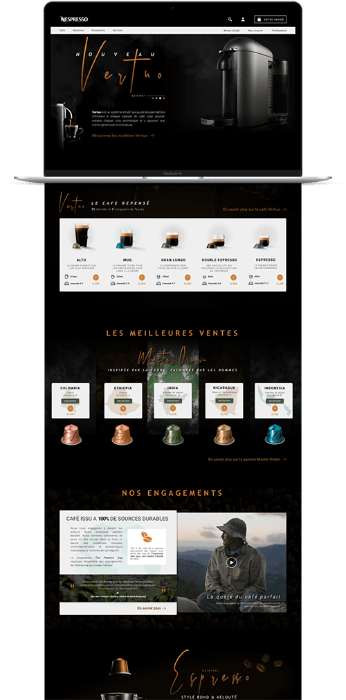 Nespresso is the first redesign I did, in Hetic. The aim was to identify Nespresso's graphic identity and targeted costumers, so that it can help us to rethink the website's homepage. I wanted to follow Nespresso's luxuous identity, as well as putting the accent on their ethics, and their taste for exostism.