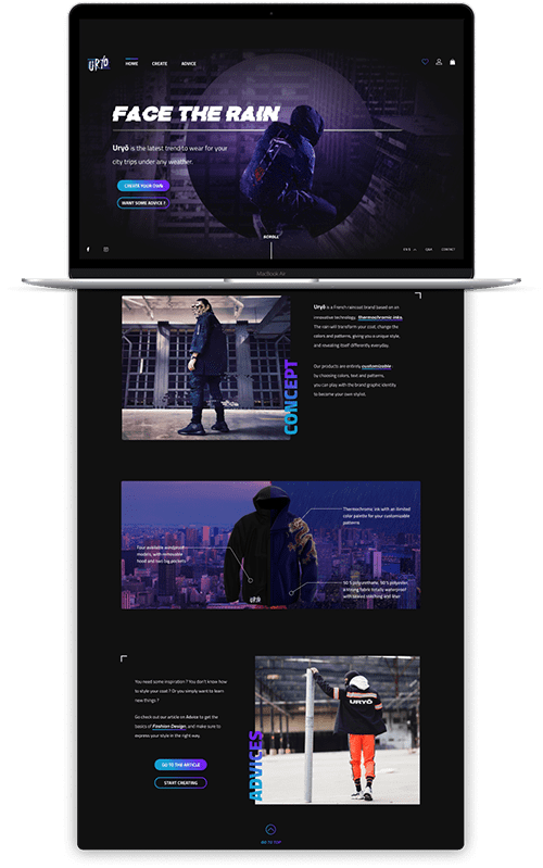During Hetic's intensive week of Design, each team had to create an "Unique" fashion brand. Our team created 雨量Uryō, a raincoat brand based on thermochromatic inks, which allows the coat to change its color when it will be in contact with raindrops. As the Lead Designer, I worked on the wireframes provided by other members of my team to design the graphic models of the homepage and product pages. I wanted that the brand's graphic identity blends in well with the environment that inspired its creation : the futuristic cities of Hong Kong, Taipei, Seoul and Tokyo.